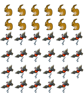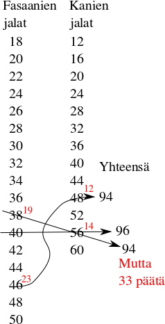 Lasketaan jalat. Niitä on liikaa. Siispä ruvetaan vaihtamaan fasaaneja kaneiksi. Jokaisesta kanista tulee kaksi jalkaa lisää. Lopuksi saadaan oikea määrä elukoita: