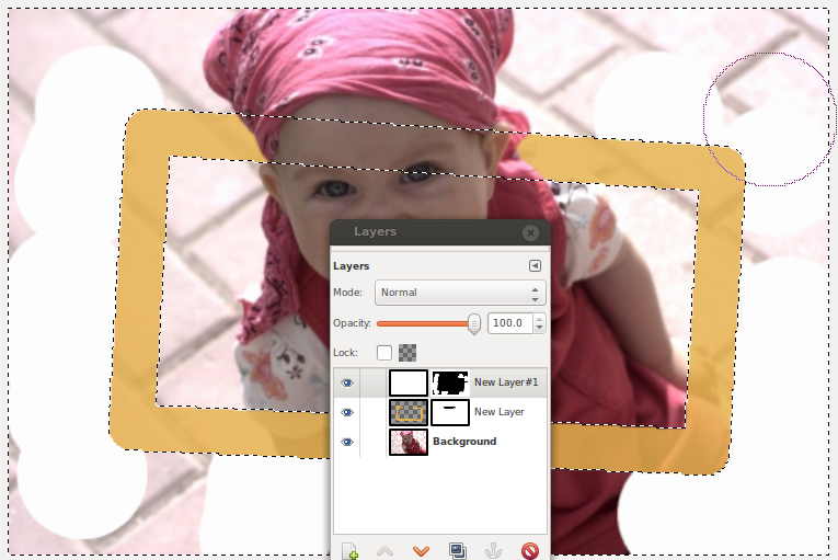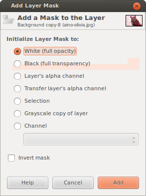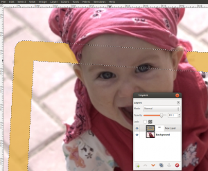 Poistetaan se ensin. Kun valinta on päällä, työkalut reagoivat vain valittuun alueeseen. Ensin kannattaa tehdä uusi tasomaski, eli Tasot-ikkunasta (Ctrl-L) oikealla napilla ylimmäisen tason nimestä painaen Lisää tasomaski:
