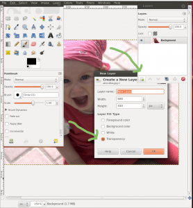 Lataa kuva esim. vetämällä se GIMPpiin. Avaa Tasot-ikkuna, eli Telakoituvat valintaikkunat tai Ctrl-L. Tee uusi läpinäkyvä taso.