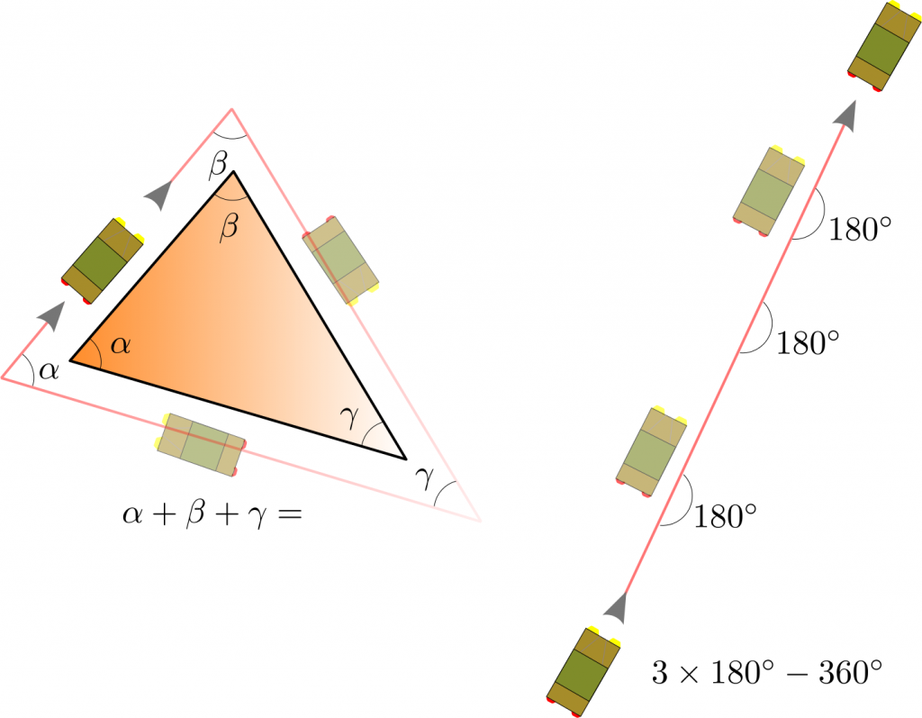 Autoilija ajaa kierroksen, jossa on kolme kulmaa, $\alpha$, $\beta$ ja $\gamma$, ja palaa samaan lähtöpaikkaan samaan asemaan. Hän on siis kääntynyt täyden ympyrän eli $360^\circ$.