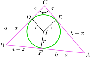 Olkoon $x=CD=CE$ (miksi?). Merkitään alla olevan kuvan mukaisesti janan $c$ pituudeksi $AB$ on $c =AB= (a-x)+(b-x)$, josta saadaan