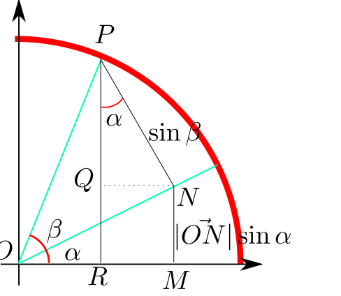 $\sin(\alpha+\beta) = PR = PQ + QR = \sin\beta\cos\alpha + \cos\beta\sin\alpha$