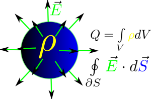 Differentiaalimuodosta nähdään sama juttu; suljetun avaruuden osan yli, kaukana sähkövarauksista, sähkökentän vuo on nolla. $\vec E$-kentän divergenssi on nolla. Jos tutkittavassa avaruuden osassa on varausta, tilanne muuttuu; $\rho\neq0$. Positiivinen varaus on kentän lähde ja negatiivinen nielu. Kokonaismäärä sähkökenttää pinnan yli on verrannollinen pinnan sisällä olevaan varaukseen.