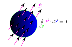 Tarkoittaa, että ei ole magneettisia monopoleja. Jokaisessa kuviteltavissa olevassa tilavuudessa on yhtä paljon meneviä ja tulevia “kenttäviivoja”. Ei ole olemassa magneettista varausta.