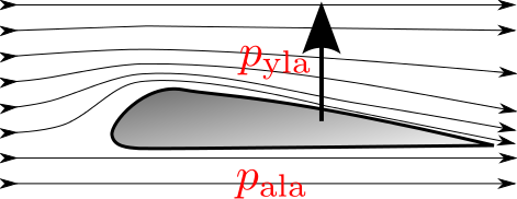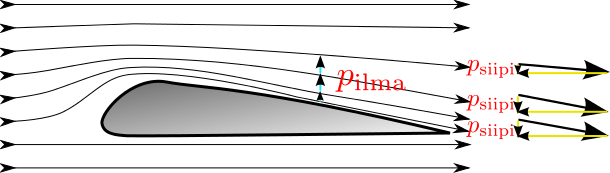 seuraten siiven yläpuolle tulee pienempi paine kuin alapuolelle, siis $\Delta p = p_\text{yla} – p_\text{ala} > 0$. Paine-erosta saadaan ylöspäin suuntautuva voima, kun se kerrotaan siiven pinta-alalla.