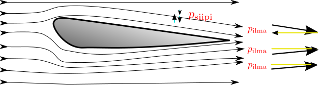 Kuvassa näkyy siiven poikkipinta. Koska ilma pysyy paikallaan ja siipi liikkuu, kun ilman ja siiven suhteellinen nopeusero suurempi yläpuolella kuin alapuolella.