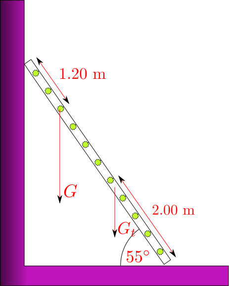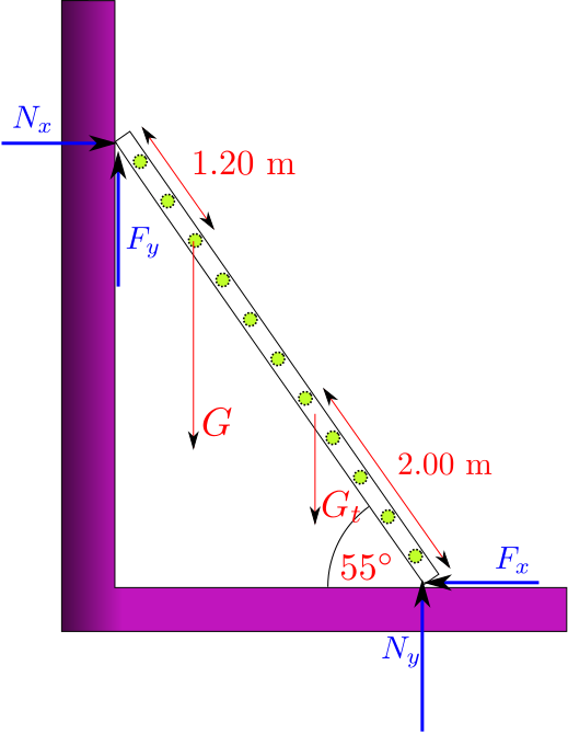 Tikkaat nojaavat lähes kitkattomasti pystysuoraan seinään siten, että niiden kaltevuuskulma on $55^\circ$. Tikkaiden massa on $28$ kg ja pituus $4.80$ m. Tikkaiden painopiste sijaitsee $2.00$ m:n etäisyydellä alapäästä. Kuinka suuri pitää tikkaiden ja lattian välisen kitkakertoimen olla, jotta $65$ kg:n painoinen henkilö voi seiso $1.20$ metrin etäisyydellä tikkaiden yläpäästä ($3$. puola) ilman, että tikkaat alkavat liukua?